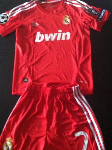 Real Madrid fans: With Jose Mourinho managing one of the top elite club teams of the world, Real Madrid FC is definitely making a statement to the world as one of the most powerful soccer clubs. With their starting lineup consist of #4 SERGIO RAMOS, #8 KAKA, #10 OZIL, #7 RONALDO, & #20 HIGUAIN, Real Madrid FC will be looking to score tons of goals this year in all competitions. Their quest for the UEFA Champions League and La Liga title will be under everyone's radar after losing to Barcelona FC in consecutive seasons. Therefore, you do not want to miss out on this new awesome looking Champion League away jersey of #7 RONALDO for this new soccer season as the road begins for their conquest of the 2011-12 UCL title begins.Adidas #7 Ronaldo Real Madrid Kids Soccer Youth Set Jersey + Shorts Champion League Away Red Size Large 11-13 Years Old Feature